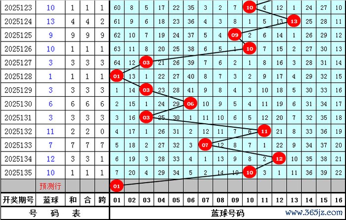 蓝球分析:上期蓝球落在第三区号码10,最近50期四区蓝球落号个数比为11:13:13:13,一区蓝球出现较少,本期展望蓝球出当今第一区,精选蓝球01。